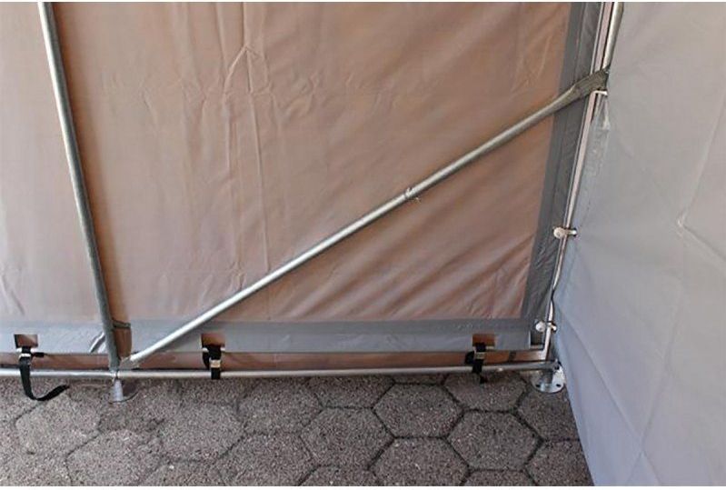 Nous fournissons avec cette tente un système d’ancrage au sol complet, conforme à la stabilité. Vous avez la possibilité de choisir entre deux systèmes, soit pour un sol mou (par ex. la terre) ou un sol dur (par ex. en béton)