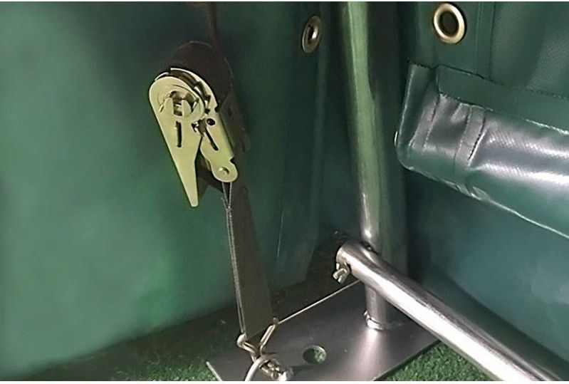 - Un système de sangles sophistiqué sert à fixer la bâche à la structure et à tendre la toile en PVC sur l’armature en acier
