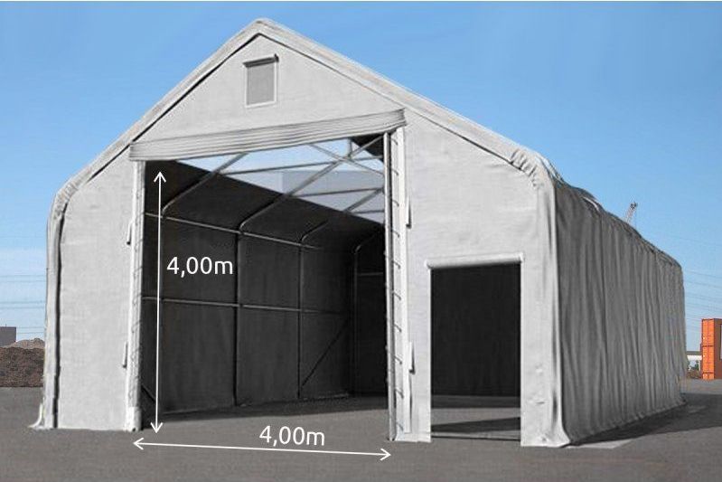 - Les bâches de pignon avant et arrière ont une grande ouverture de 4,00 x 4,00m avec une Porte Store et une petite ouverture de 1,2 x 2,1m avec une Porte à Fermeture Eclair robuste