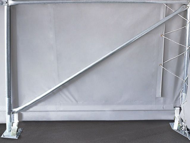 - Double système de tension des bâches pour une meilleure stabilité. La bâche est tendue horizontalement grâce à un cliquet sur chaque socle des pieds pour tendre la bâche sur les côtés. Et elle est tendue verticalement grâce à une fixation sur les deux côtés du pignon avec un système de cordes.
