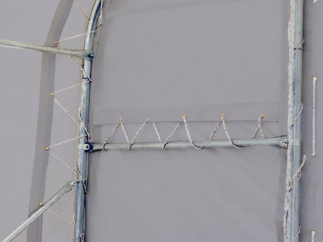 - Un système de cordes sert à fixer la bâche à la structure et à tendre la toile en PVC sur l’armature en acier
