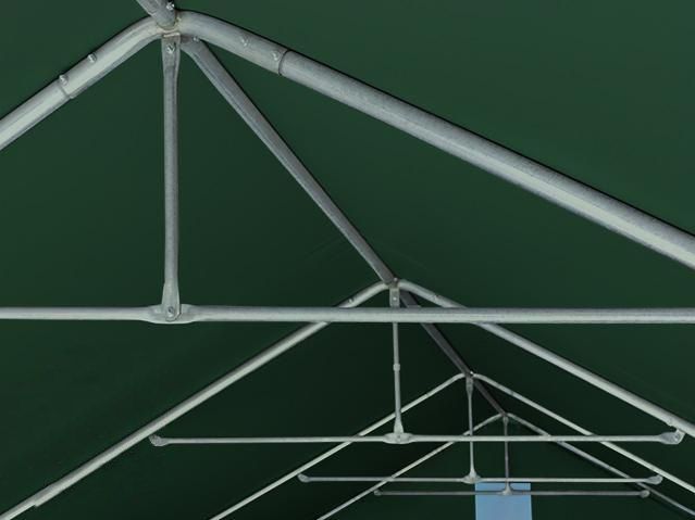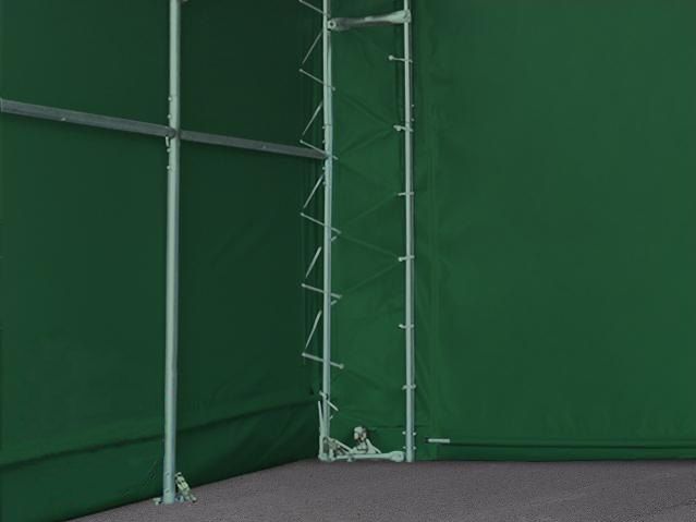 - Double système de tension des bâches pour une meilleure stabilité. La bâche est tendue horizontalement grâce à un cliquet sur chaque socle des pieds pour tendre la bâche sur les côtés. Et elle est tendue verticalement grâce à une fixation sur les deux côtés du pignon avec un système de cordes.