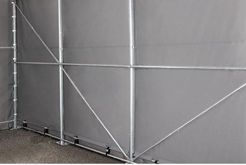 - Un système de sangles sophistiqué sert à fixer la bâche à la structure et à tendre la toile en PVC sur l’armature en acier
