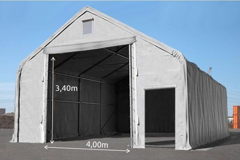 - Les bâches de pignon avant et arrière ont une grande ouverture de 4,00 x 3,40m avec une Porte Store et une petite ouverture de 1,2 x 2,1m avec une Porte à Fermeture Eclair robuste